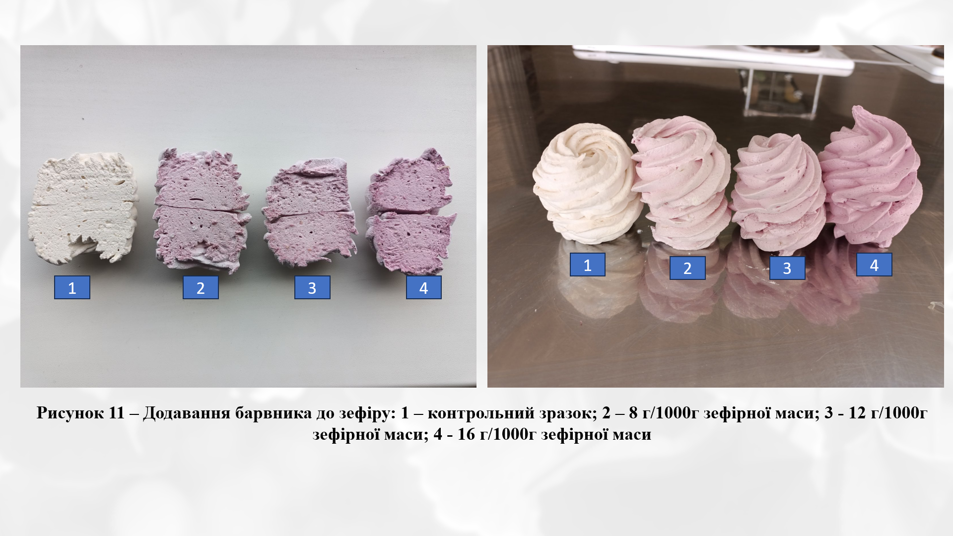 Апробацію розроблених харчових барвників здійснювали у складі різних харчових продуктів, зокрема м’якого морозива, бісквітних виробів та яблучного зефіру, що дозволило оцінити їх технологічну придатність, стабільність у рецептурних системах і вплив на споживчі властивості готової продукції.