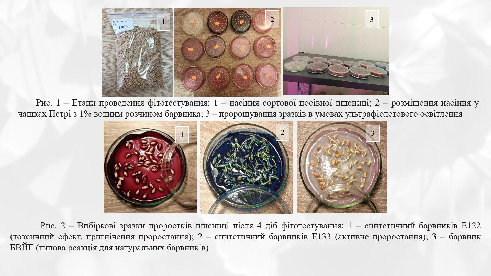 Окремий етап досліджень було присвячено оцінюванню біологічної дії розроблених барвників. Для цього проведено фітотестування із застосуванням рослинних тест-об’єктів, що дало змогу проаналізувати вплив синтетичних і натуральних барвників на процеси проростання насіння та ростові показники проростків. Отримані результати дозволили оцінити рівень біологічної безпечності натуральних барвників і порівняти їх дію з синтетичними аналогами.