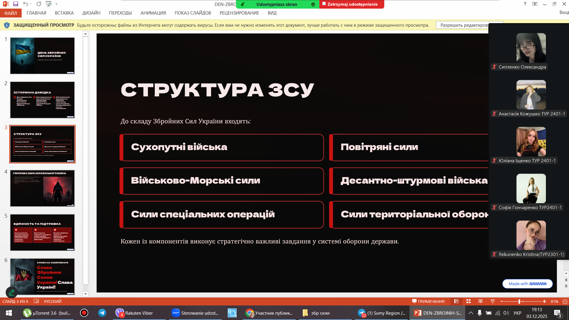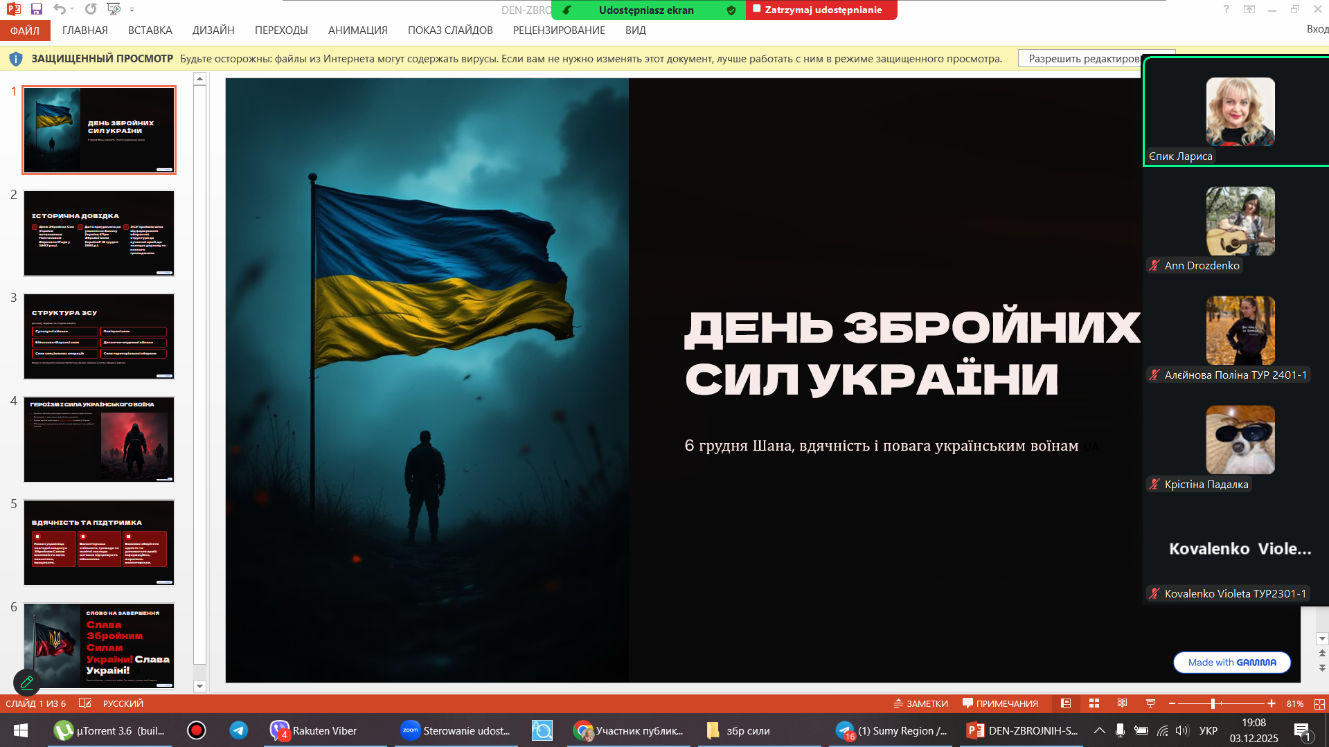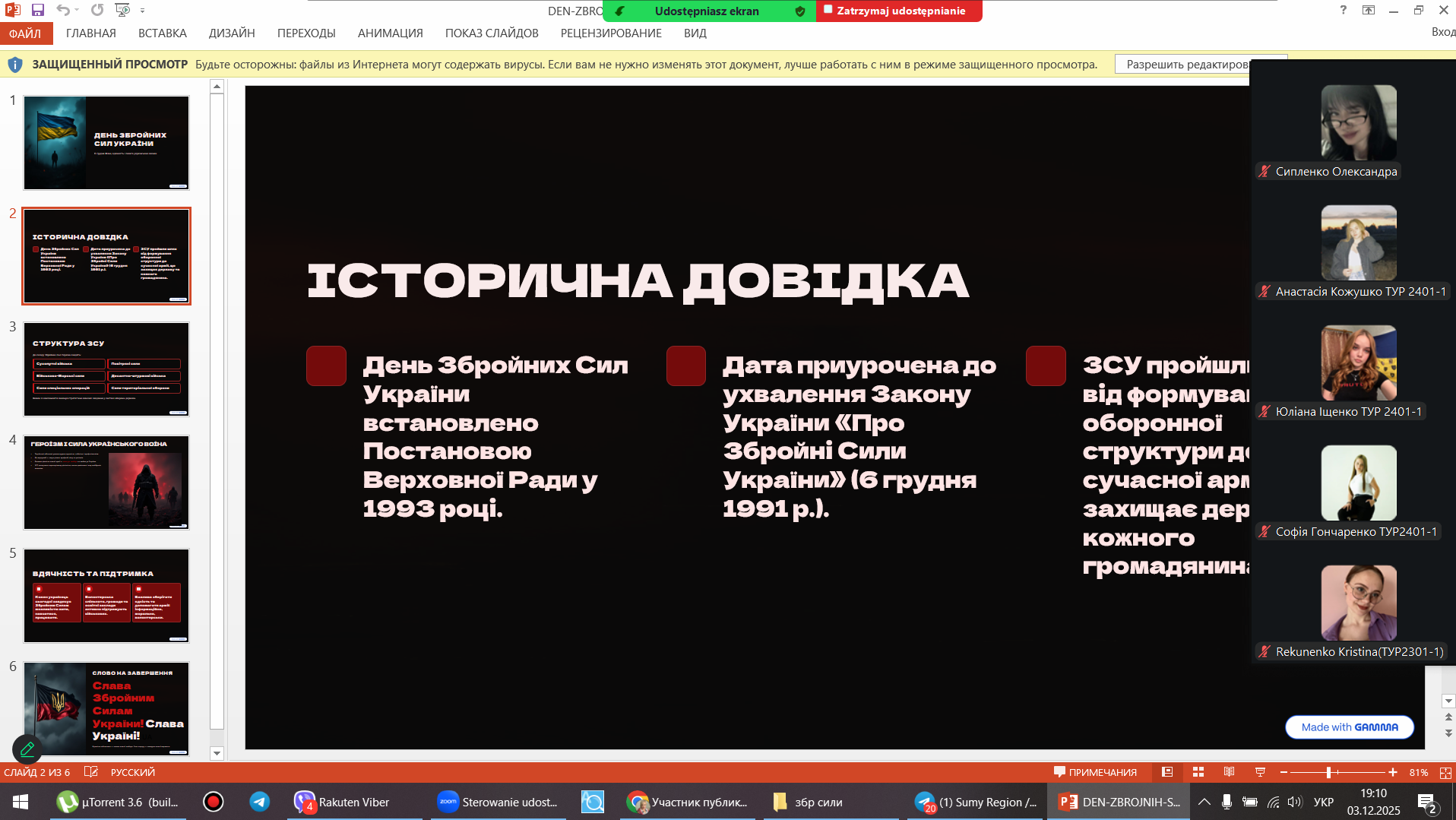Сьогодні, 3 грудня 2025 року, для студентів і магістрантів спеціальності «Туризм та рекреація» було проведено спільну кураторську годину, присвячену Дню Збройних сил України — святу сили, мужності та нескореності нашої держави.