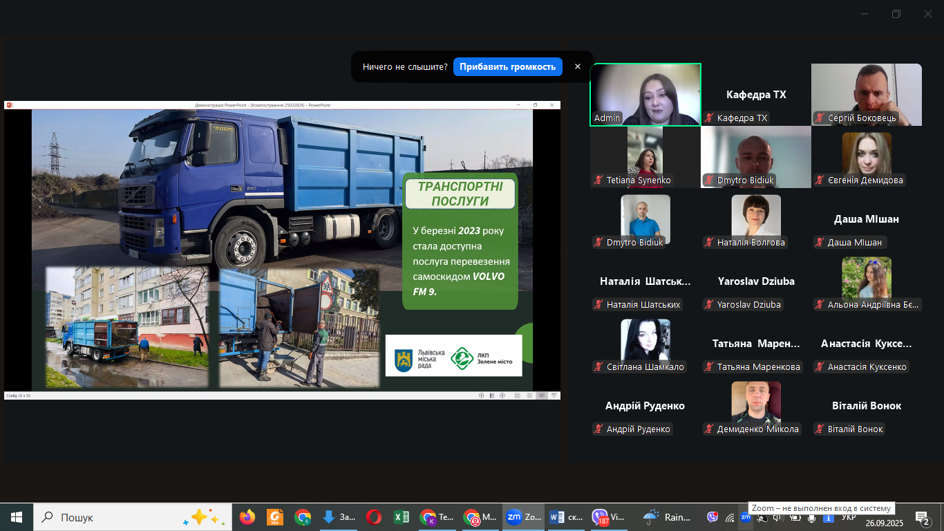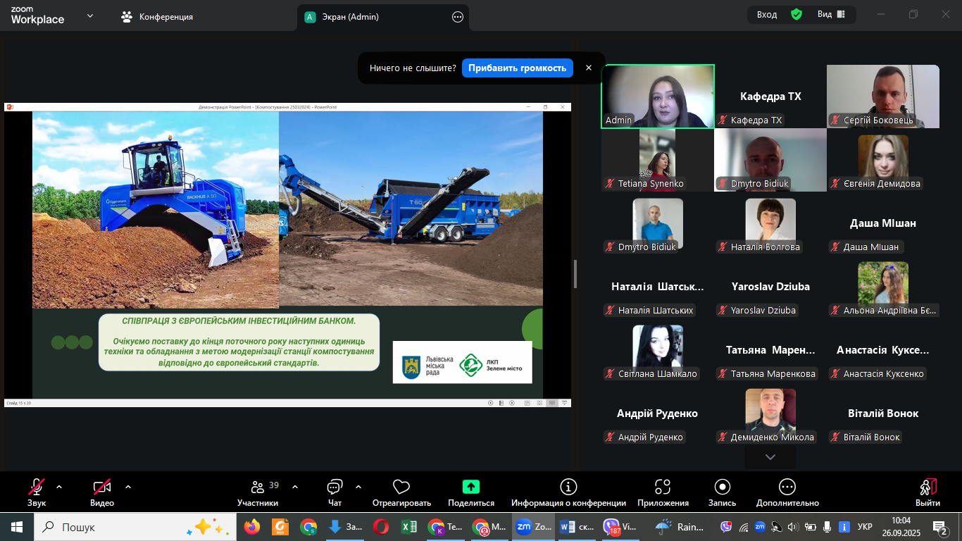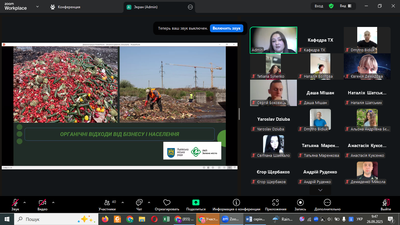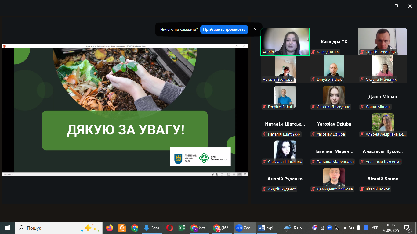 26 вересня відбулася гостьова лекція від провідного технолога відділення переробки ЛКП «Зелене місто» (м. Львів) Мирослави Білокур на тему: «Основні напрямки роботи та проєкти ЛКП «Зелене місто». Органічні відходи та переваги компостування. Впровадження компостування на прикладі Львова».