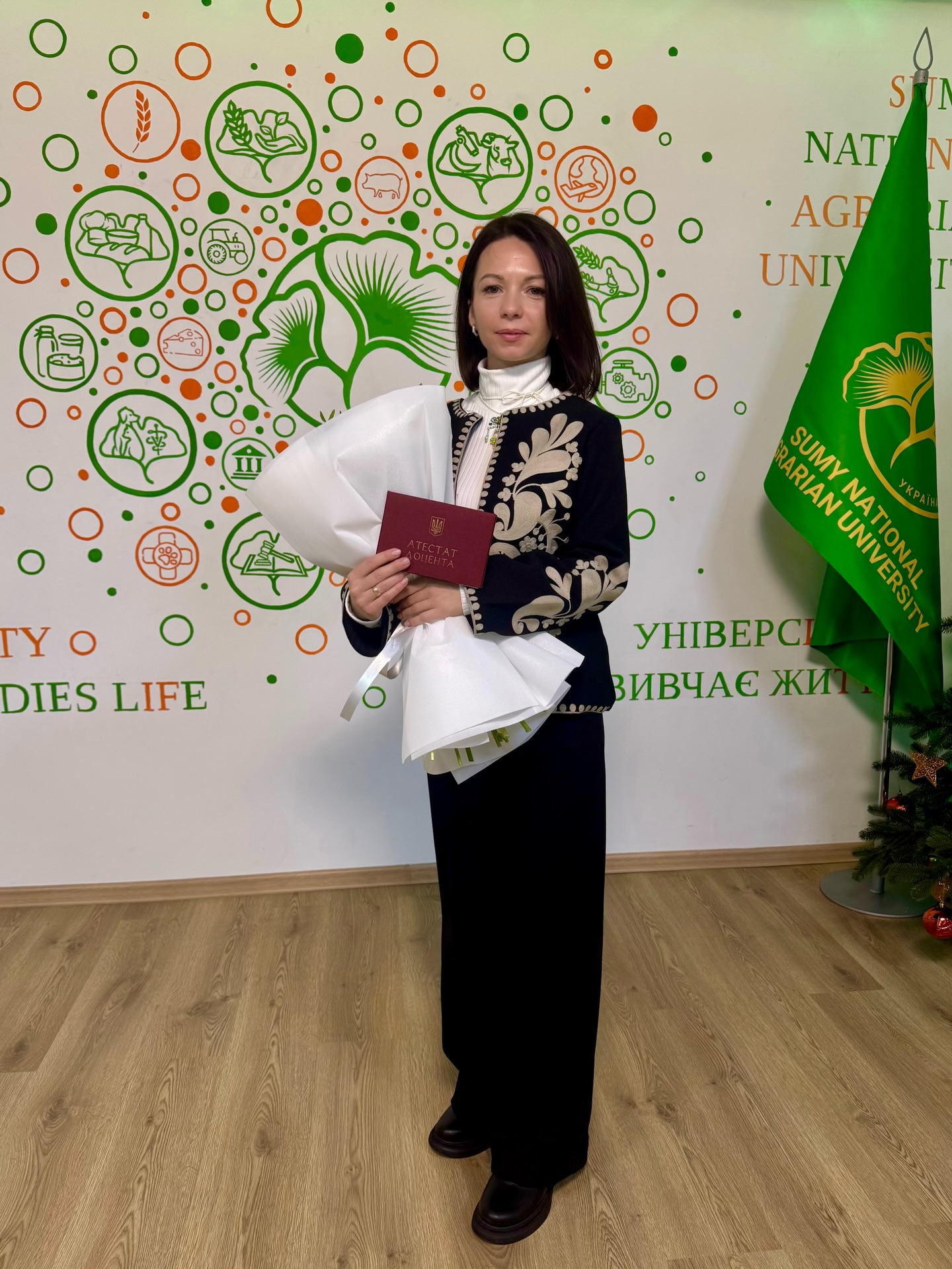 Важливою складовою святкової вченої ради стало вручення документів про здобуття наукових ступенів та вчених звань, що засвідчує сталий розвиток наукового потенціалу Сумського національного аграрного університету навіть в умовах воєнного часу. Атестат доцента був вручений Тетяні Синенко, доценту кафедри технологій та безпечності харчових продуктів.
