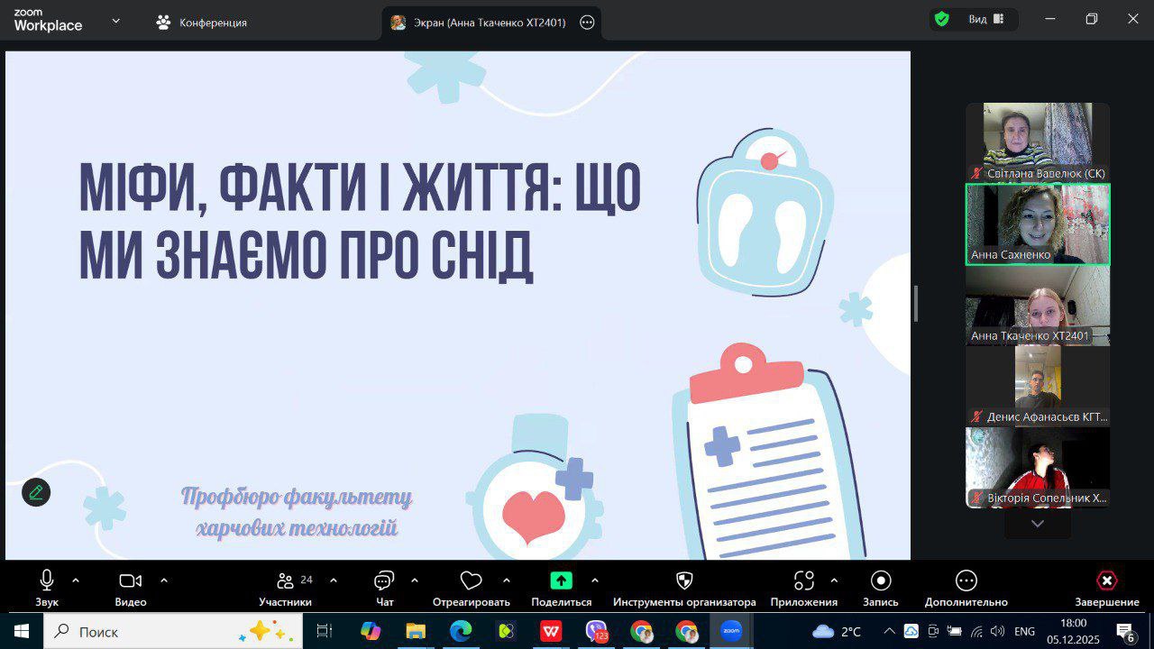5 грудня 2025 року на факультеті харчових технологій Сумського НАУ спільно з профбюро факультету було проведено тематичну кураторську годину “ВІЛ/СНІД: міфи та реальність”, приурочену Всесвітньому дню боротьби зі СНІДом для здобувачів 1-2 курсів.