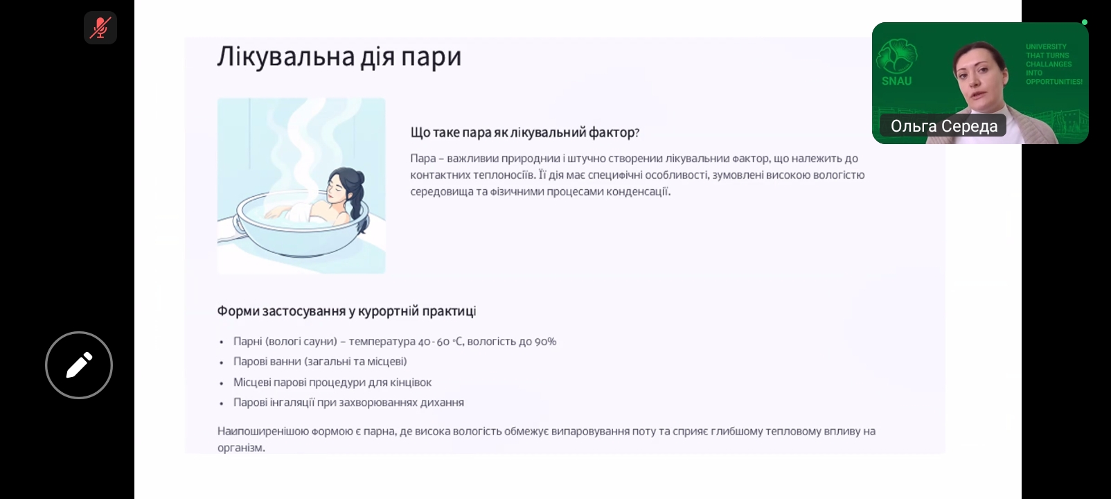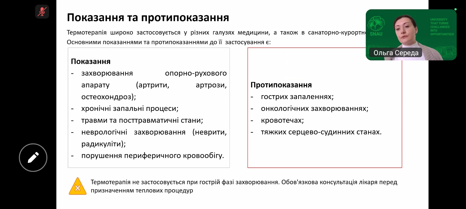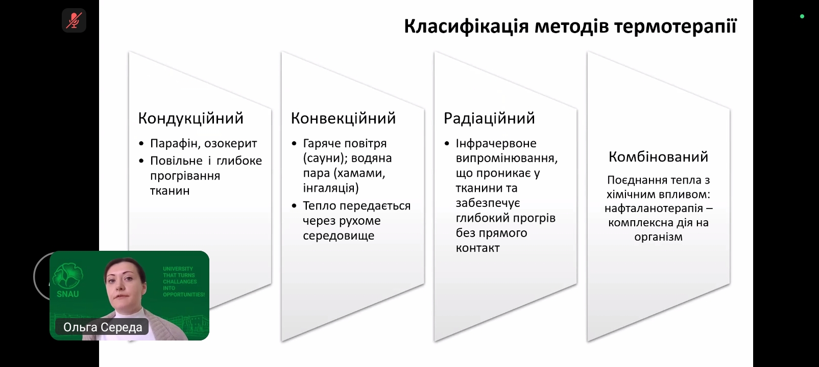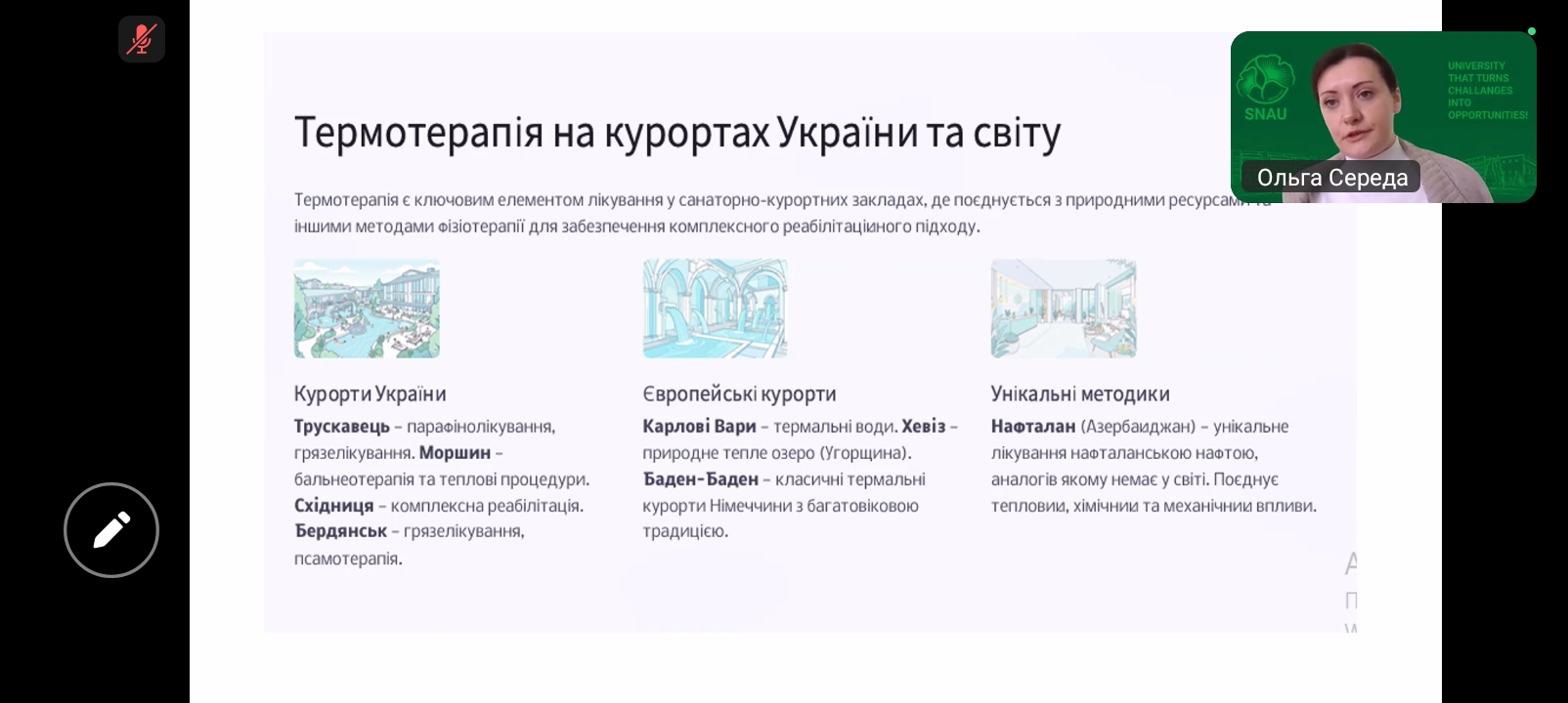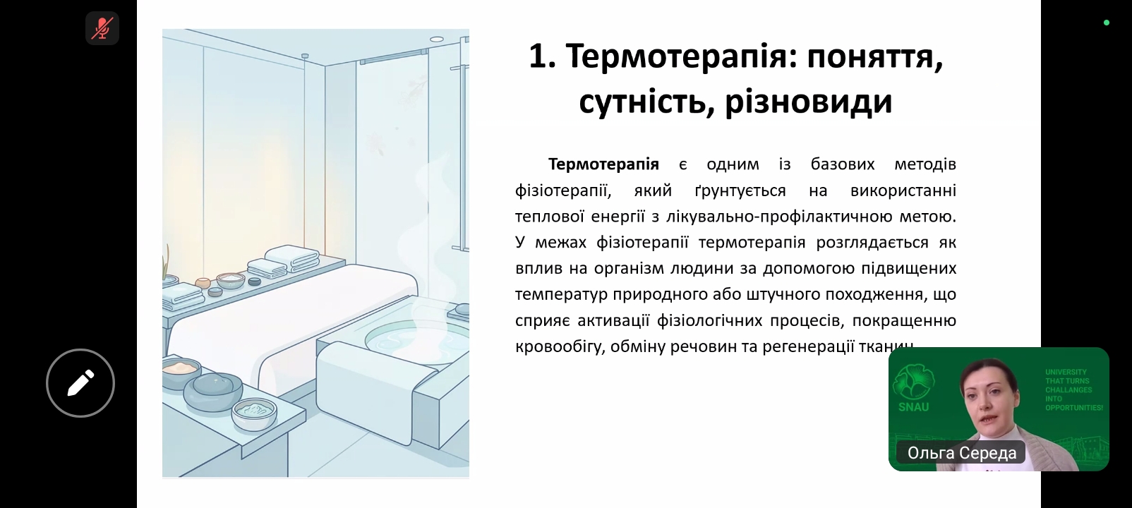 Лекторка детально висвітлила вплив теплових процедур на фізіологічні процеси організму, окреслила основні показання та протипоказання до їх використання, а також представила сучасні підходи до застосування термотерапії в оздоровчих закладах.