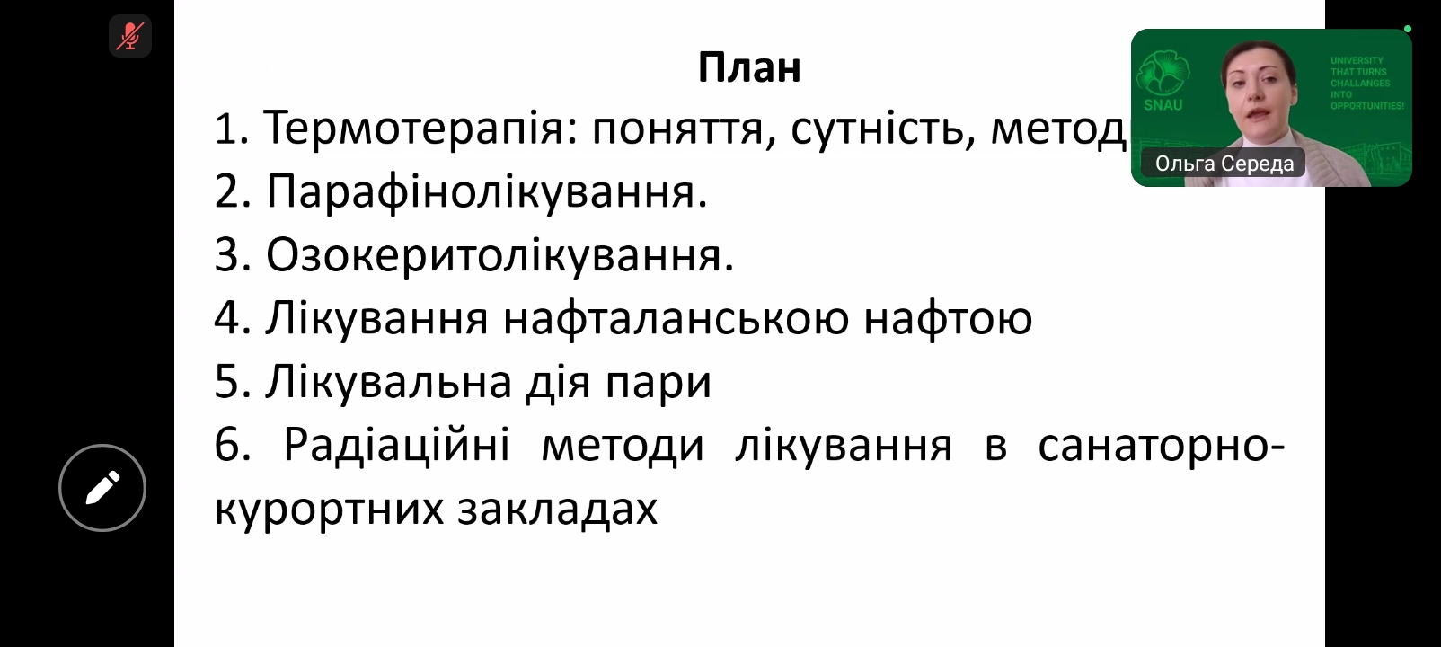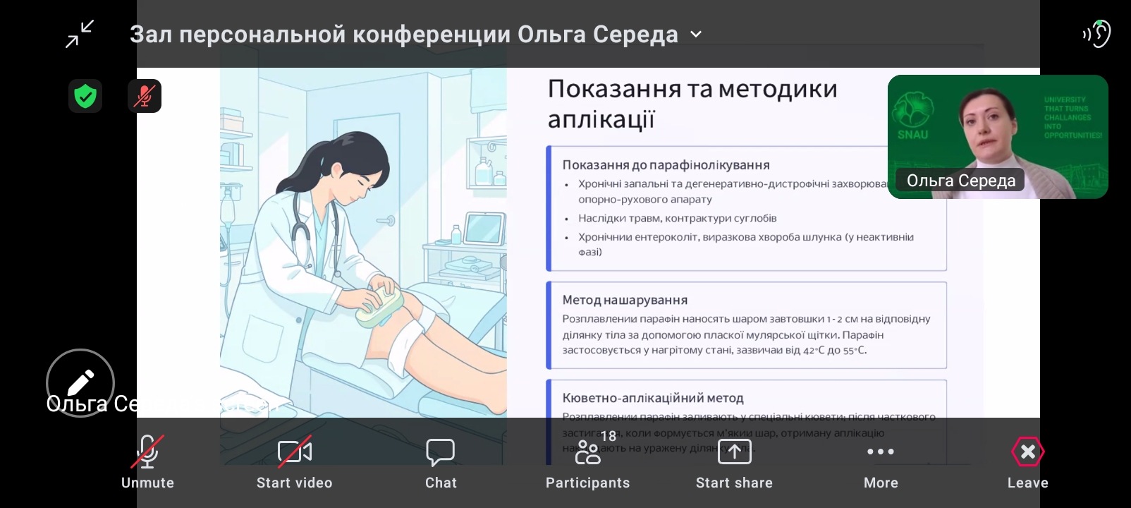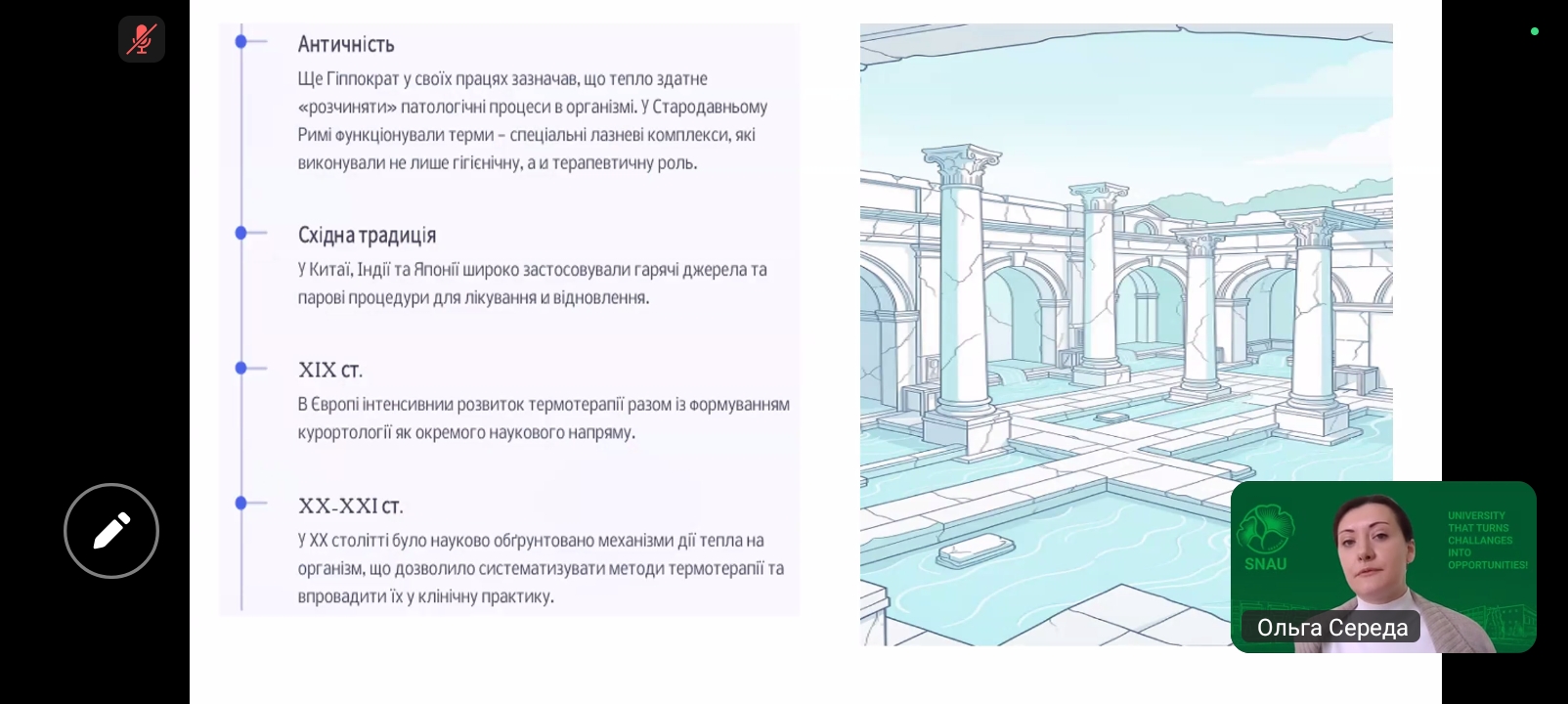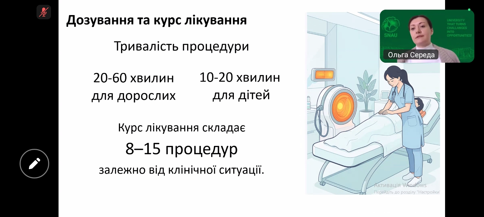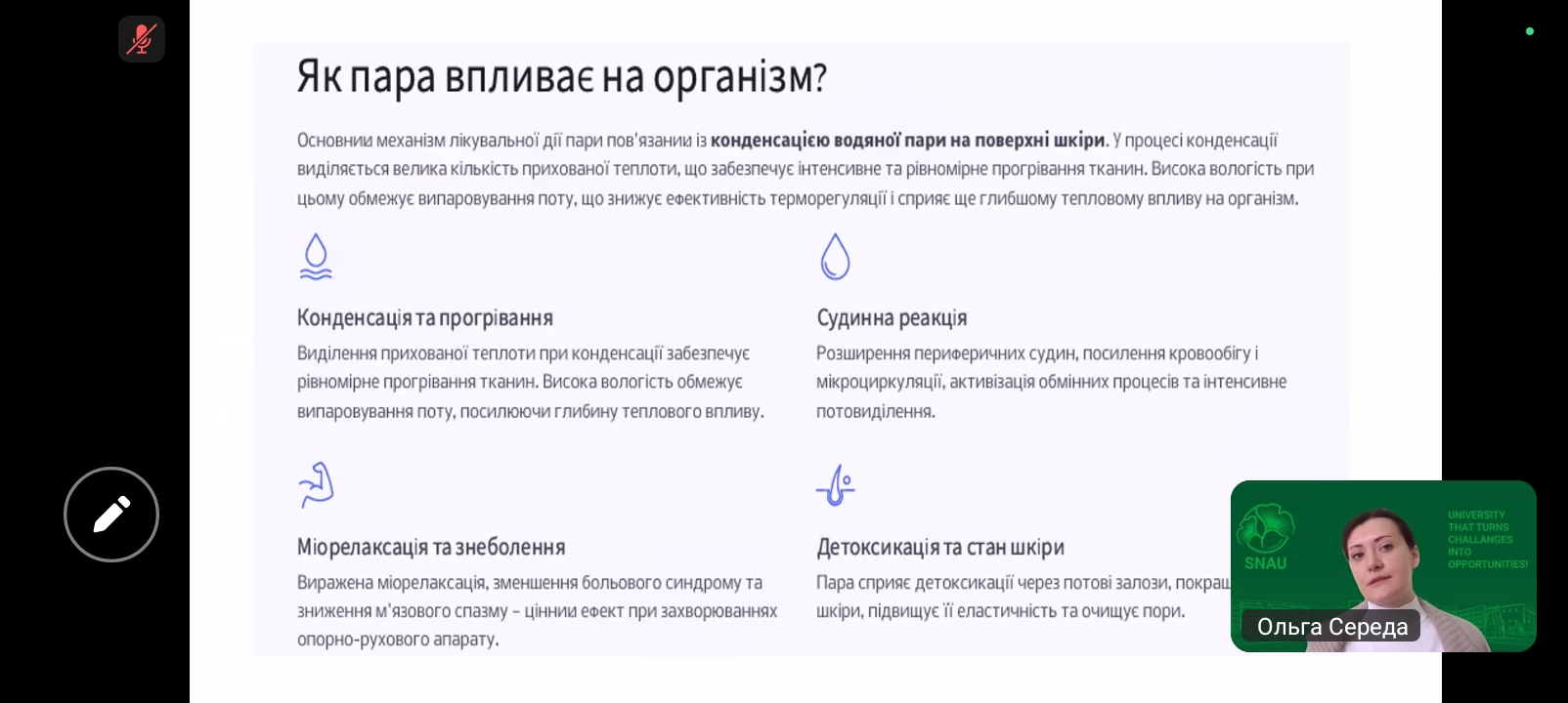 Лекторка детально висвітлила вплив теплових процедур на фізіологічні процеси організму, окреслила основні показання та протипоказання до їх використання, а також представила сучасні підходи до застосування термотерапії в оздоровчих закладах.