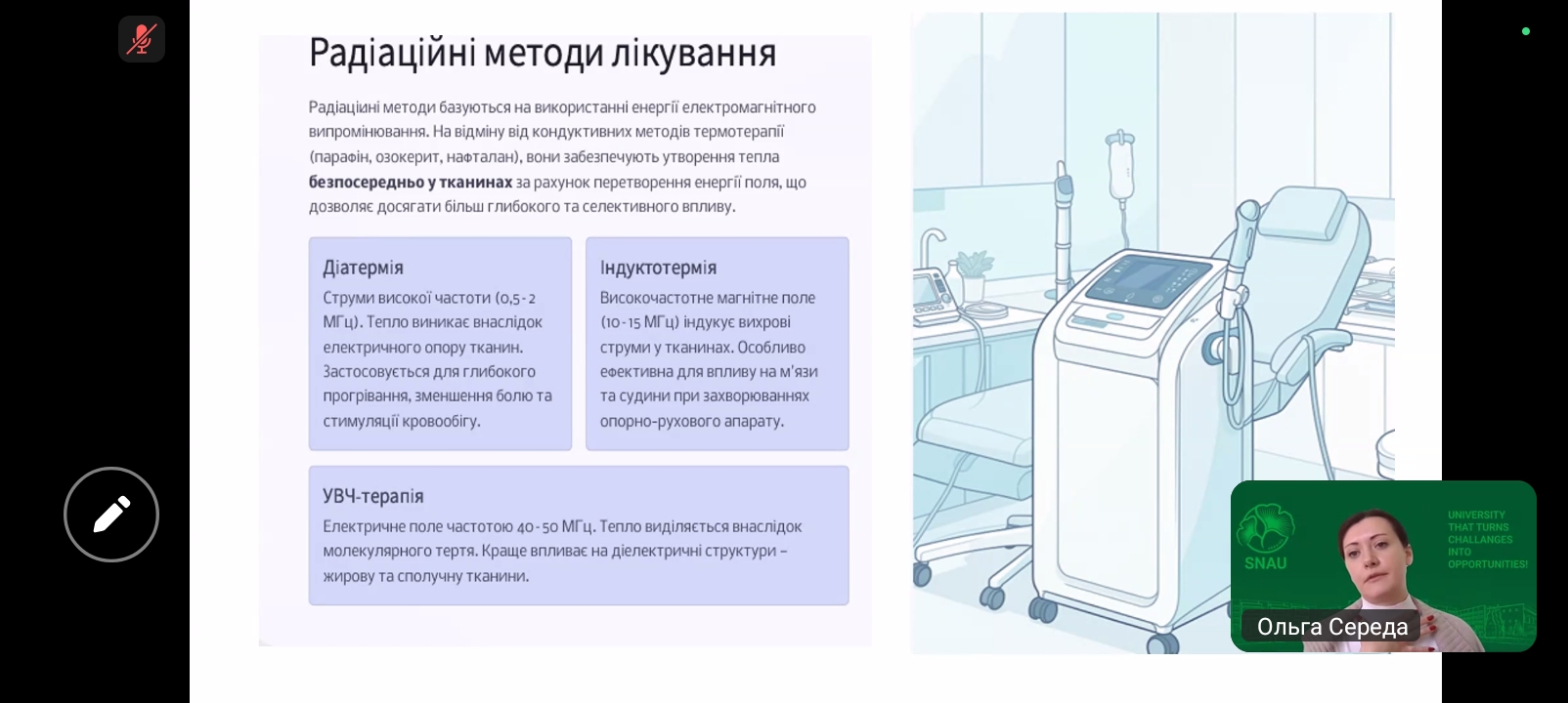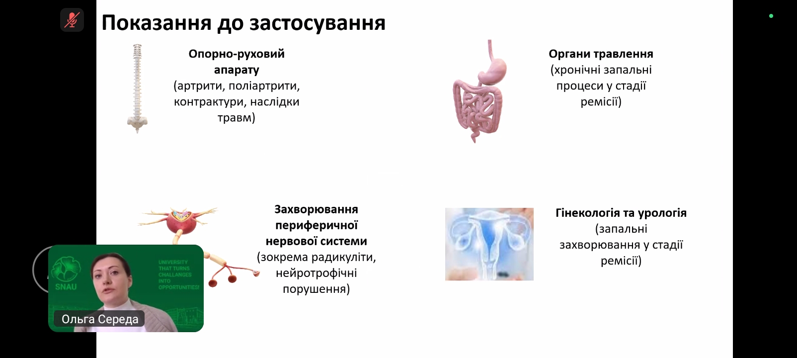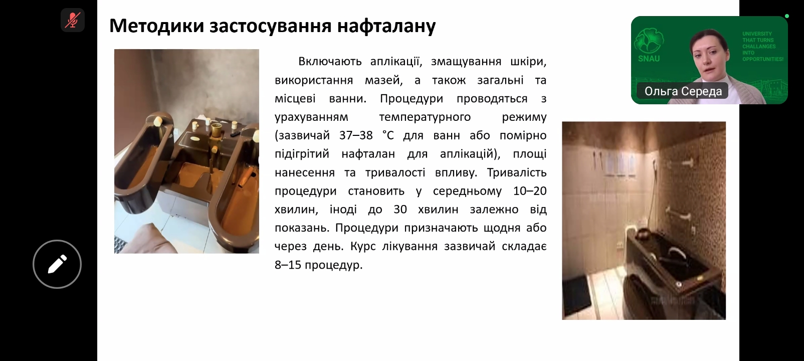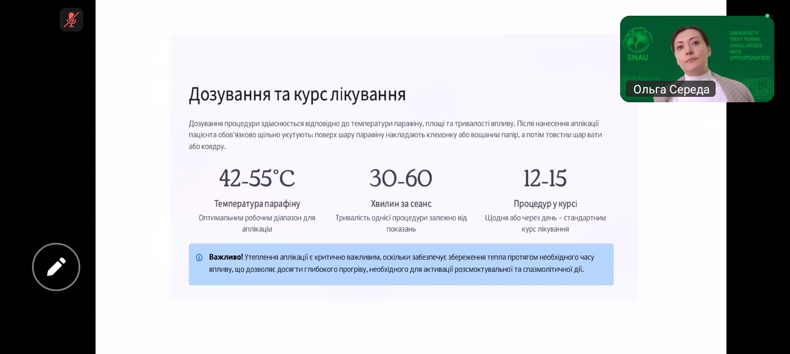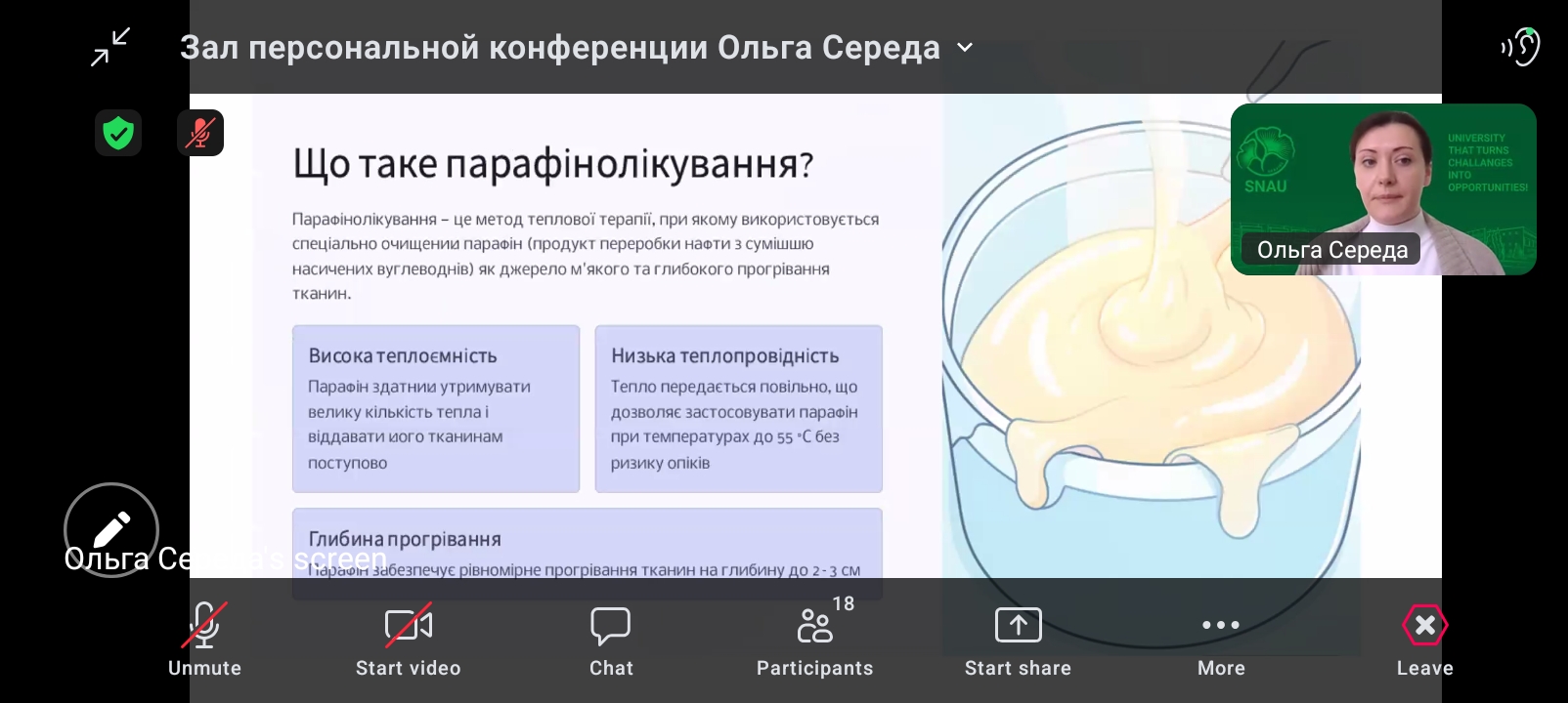 Лекторка детально висвітлила вплив теплових процедур на фізіологічні процеси організму, окреслила основні показання та протипоказання до їх використання, а також представила сучасні підходи до застосування термотерапії в оздоровчих закладах.