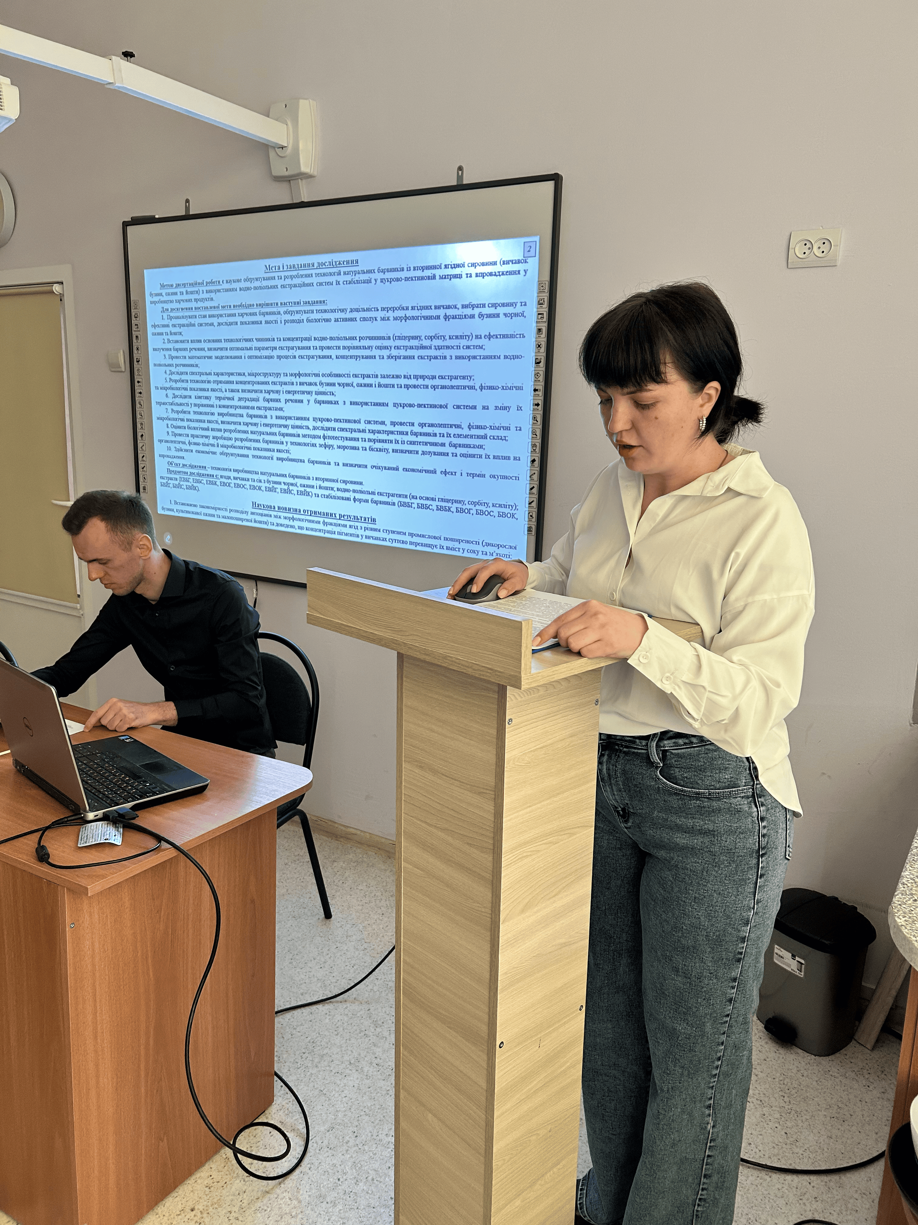 Під час доповіді було представлено результати наукового дослідження, спрямованого на розроблення технології отримання харчових барвників природного походження та можливості їх використання у виробництві харчових продуктів. Особливу увагу приділено актуальності застосування натуральних барвників у сучасній харчовій промисловості, їх технологічним властивостям, а також впливу на якість і безпечність готової продукції.