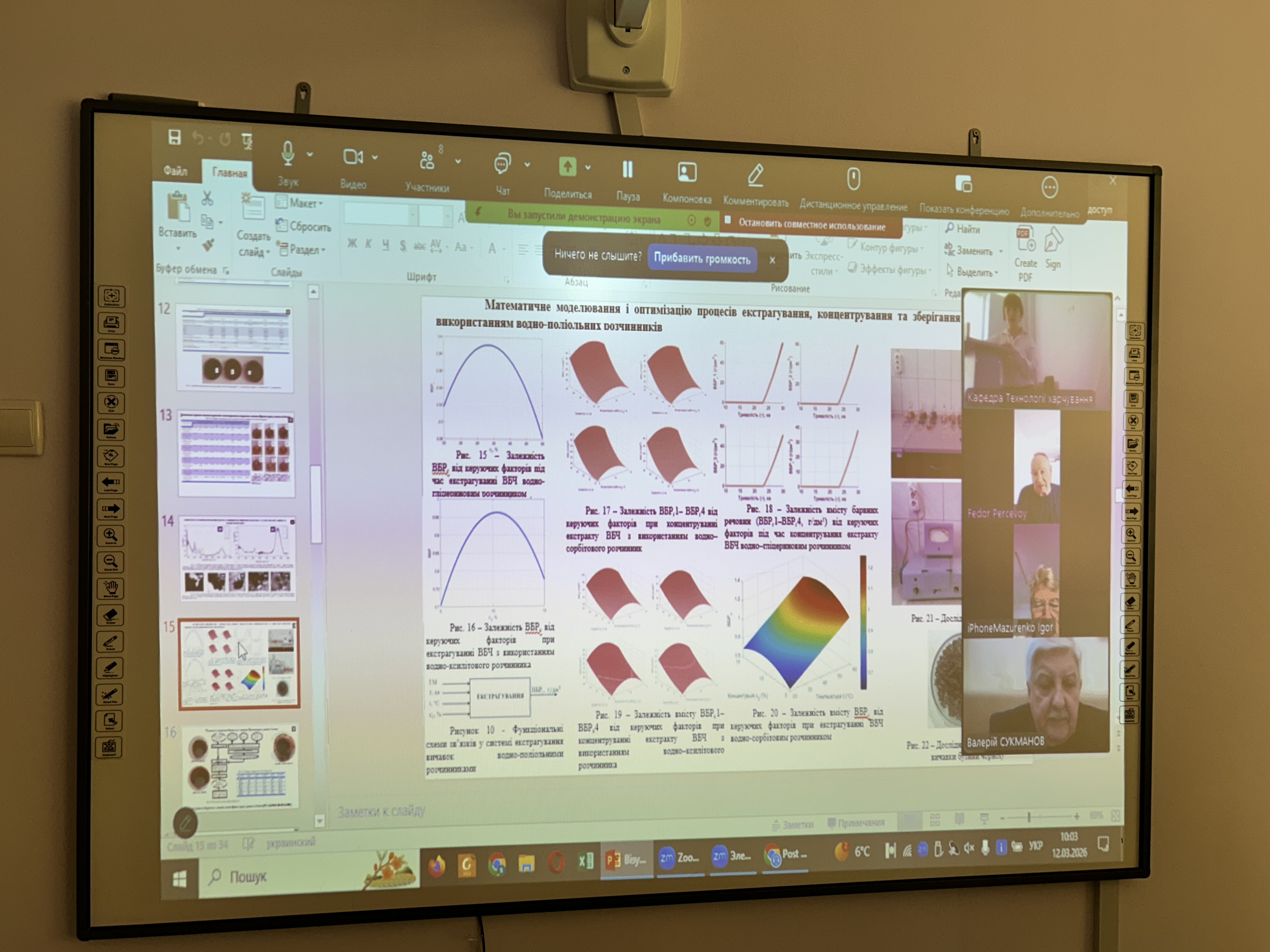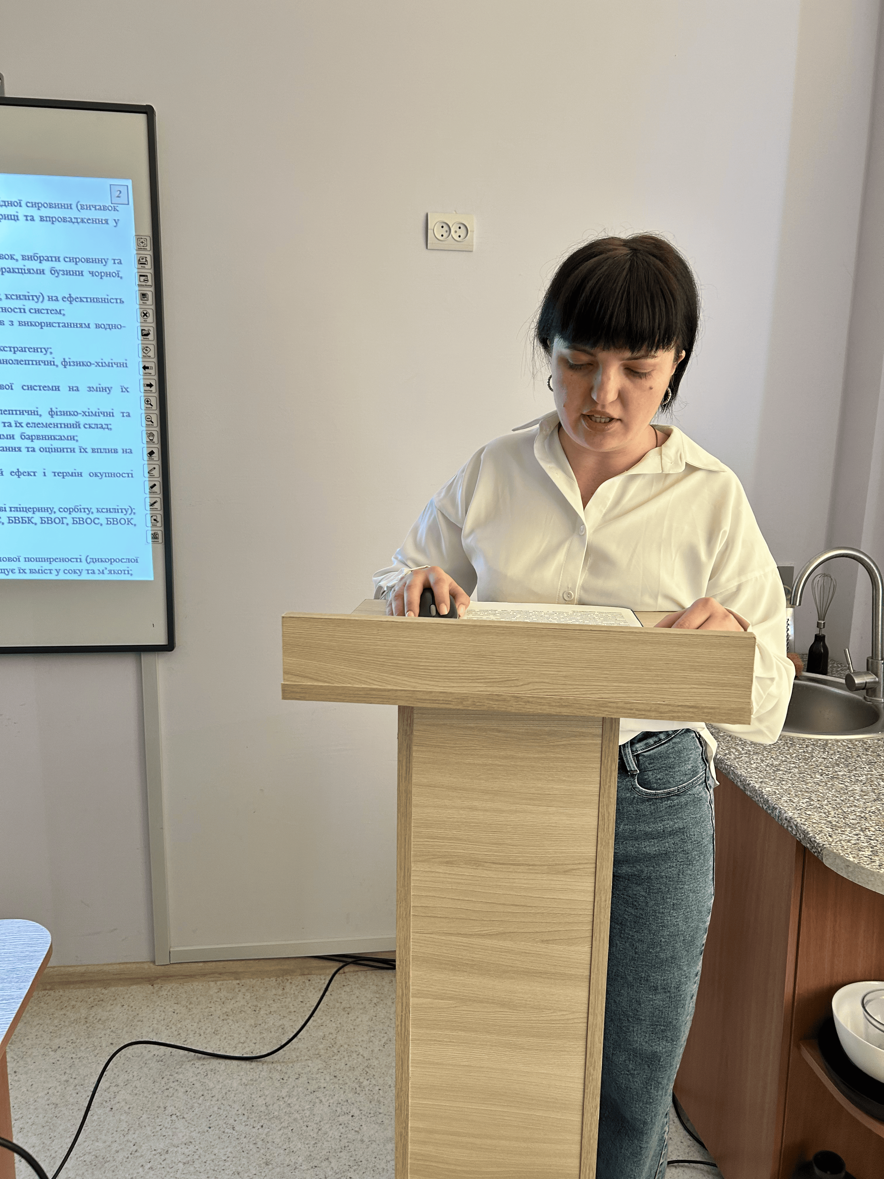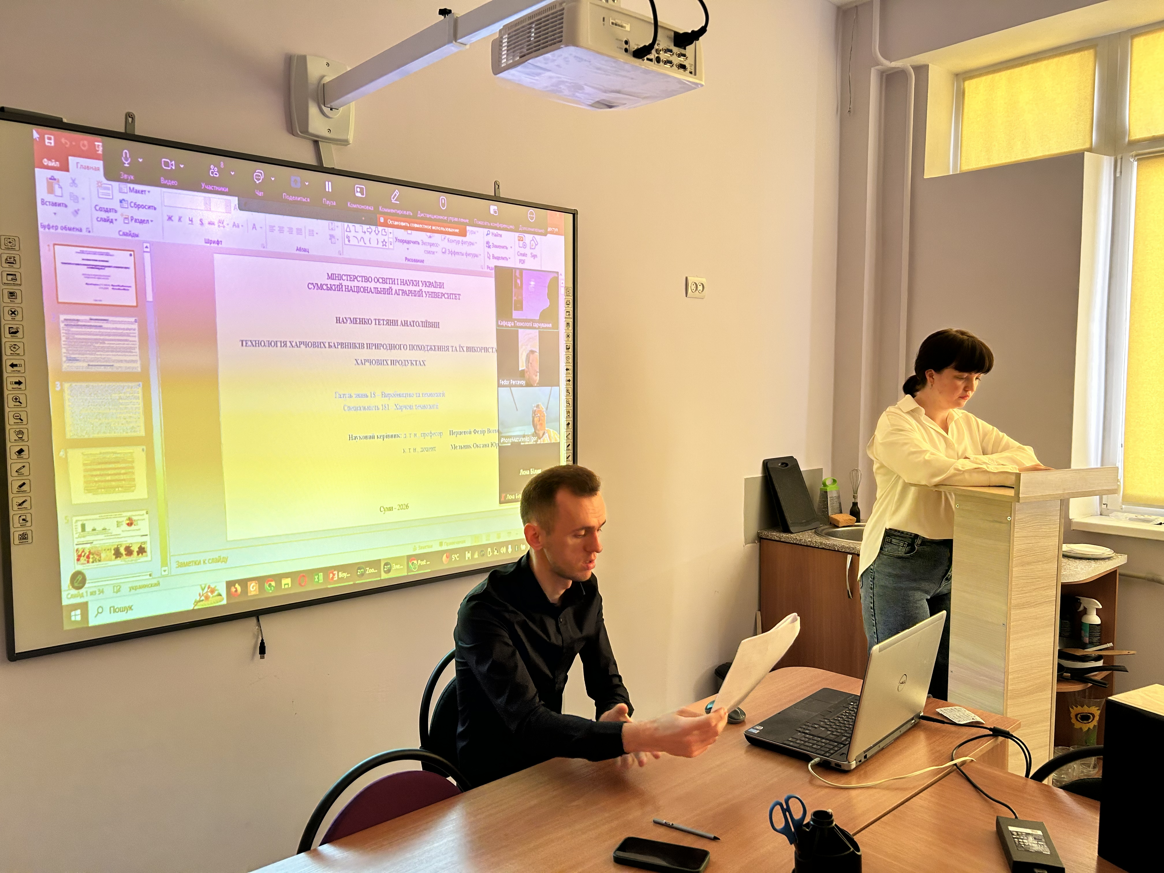 Доповідачем виступила Науменко Тетяна, здобувач СВО «Доктор філософії» за спеціальністю 181 «Харчові технології». Захід проходив у 218 аудиторії механічного корпусу, а також у форматі онлайн-конференції, що дозволило долучитися іншим учасникам.