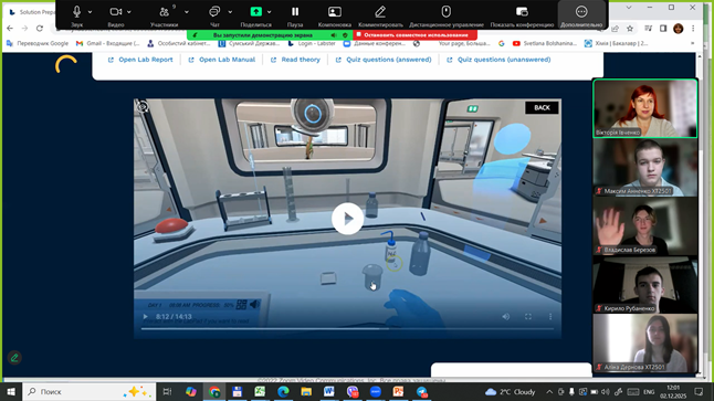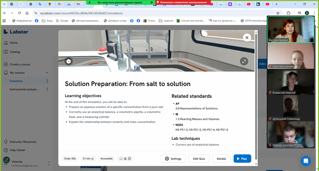 Під керівництвом к.т.н., доцента Вікторії Івченко студенти у віртуальній лабораторії опрацювали техніку безпеки, пригадали теоретичні розрахунки кількості речовини, потренувалися у зважуванні на аналітичних вагах, роботі з мірним посудом та правилах зберігання готових розчинів. Кожен працював індивідуально й отримав оцінку за точність та акуратність виконання дій.