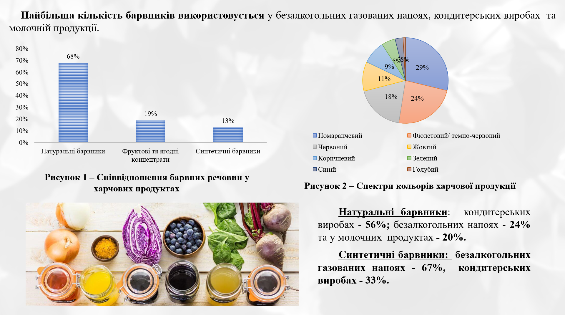 Харчові барвники відіграють важливу роль у формуванні споживчих властивостей харчової продукції. Синтетичні барвники широко застосовуються у харчовій промисловості завдяки низькій собівартості, широкому спектру кольорів і високій технологічній стабільності. Водночас у наукових джерелах зазначається, що окремі синтетичні барвники можуть становити потенційний ризик для здоров’я людини, що обумовлює актуальність пошуку безпечніших альтернатив.