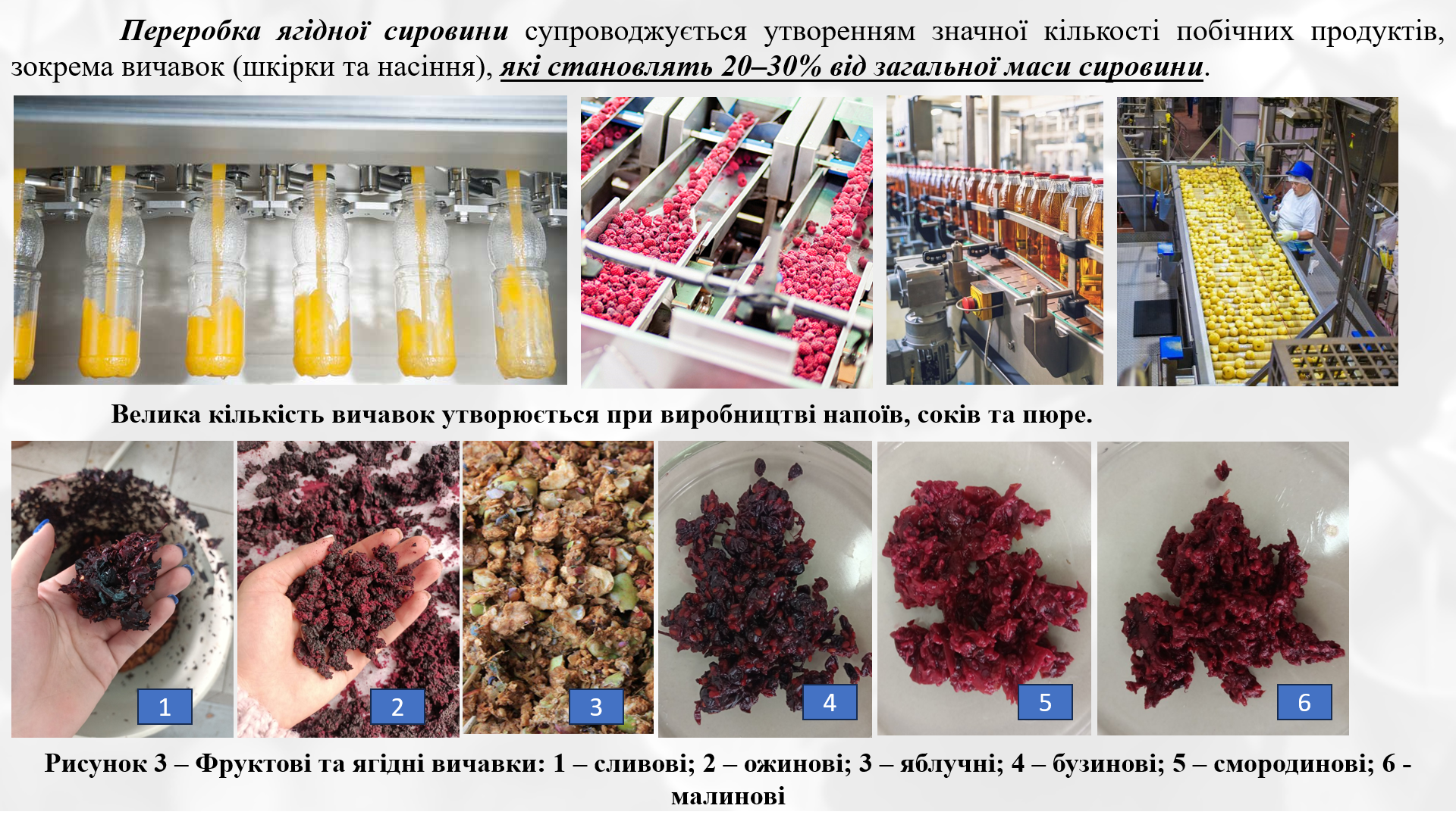 Встановлено, що ягідні вичавки характеризуються високим вмістом біологічно активних речовин, зокрема антоціанів і супутніх фенольних сполук, що зумовлює їх значний барвний потенціал. Застосування вторинної рослинної сировини дає змогу підвищити ефективність використання сировинних ресурсів, зменшити обсяги харчових відходів та реалізувати принципи ресурсозбереження і циркулярної економіки у харчових технологіях.