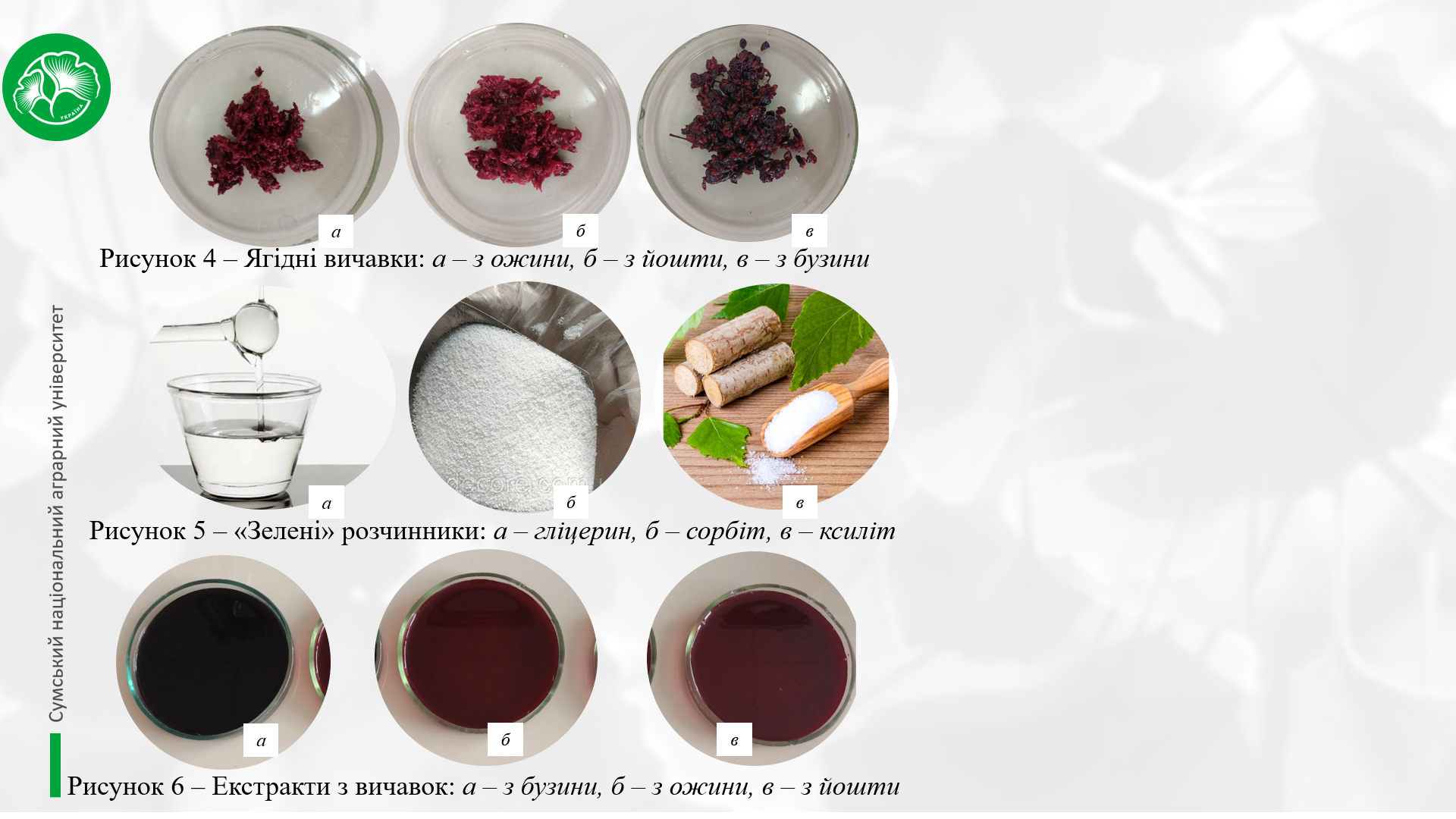 На першому етапі досліджень увагу було зосереджено на пошуку ефективних джерел барвних речовин та обґрунтуванні способів одержання натуральних барвників із використанням вторинної рослинної сировини — ягідних вичавок — у поєднанні з методами «зеленої» екстракції. Науково обґрунтовано та експериментально підтверджено доцільність використання вичавок бузини чорної, ожини та йошти як перспективної сировини для одержання натуральних харчових барвників.