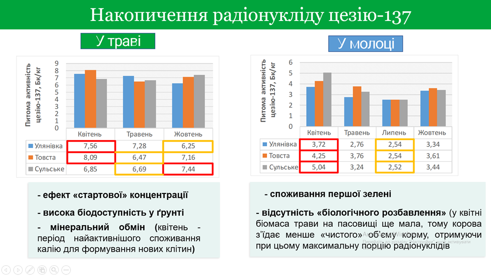 Завідувачка кафедри технологій та безпечності харчових продуктів, доктор технічних наук, професор Марина Самілик презентувала результати досліджень, проведених в межах тематики 0125U001049 «Вивчення впливу бойових дій на можливість отримання безпечної сільськогосподарської продукції», на всеукраїнській онлайн-конференції «Чорнобильські дзвони», яка відбулася 28 квітня в Тернопільському національному педагогічному університеті ім. В.Гнатюка. Дослідження проведені в межах Миколаївської селищної громади Сумської обл. (Україна) показали, що рівень радіонуклідів у траві пасовищ та молоці корів знаходяться в межах допустимих норм Молоко, вироблене на досліджуваних територіях можна вважати безпечним.