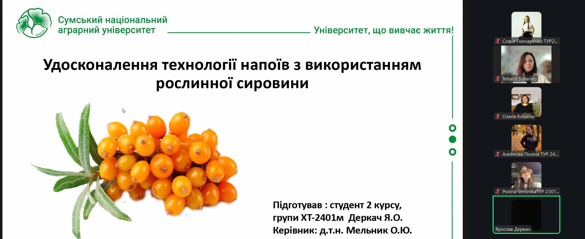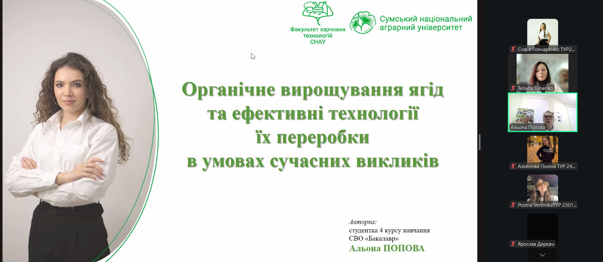 19 листопада 2025 року на факультеті харчових технологій Сумського національного аграрного університету успішно пройшла Всеукраїнська наукова конференція студентів та аспірантів, присвячена Міжнародному дню студента. Захід проходив у онлайн-форматі та об’єднав молодих науковців, які представили результати своїх досліджень і напрацювання у галузях харчових технологій, туризму, рекреації, інноваційного розвитку та сталого виробництва.