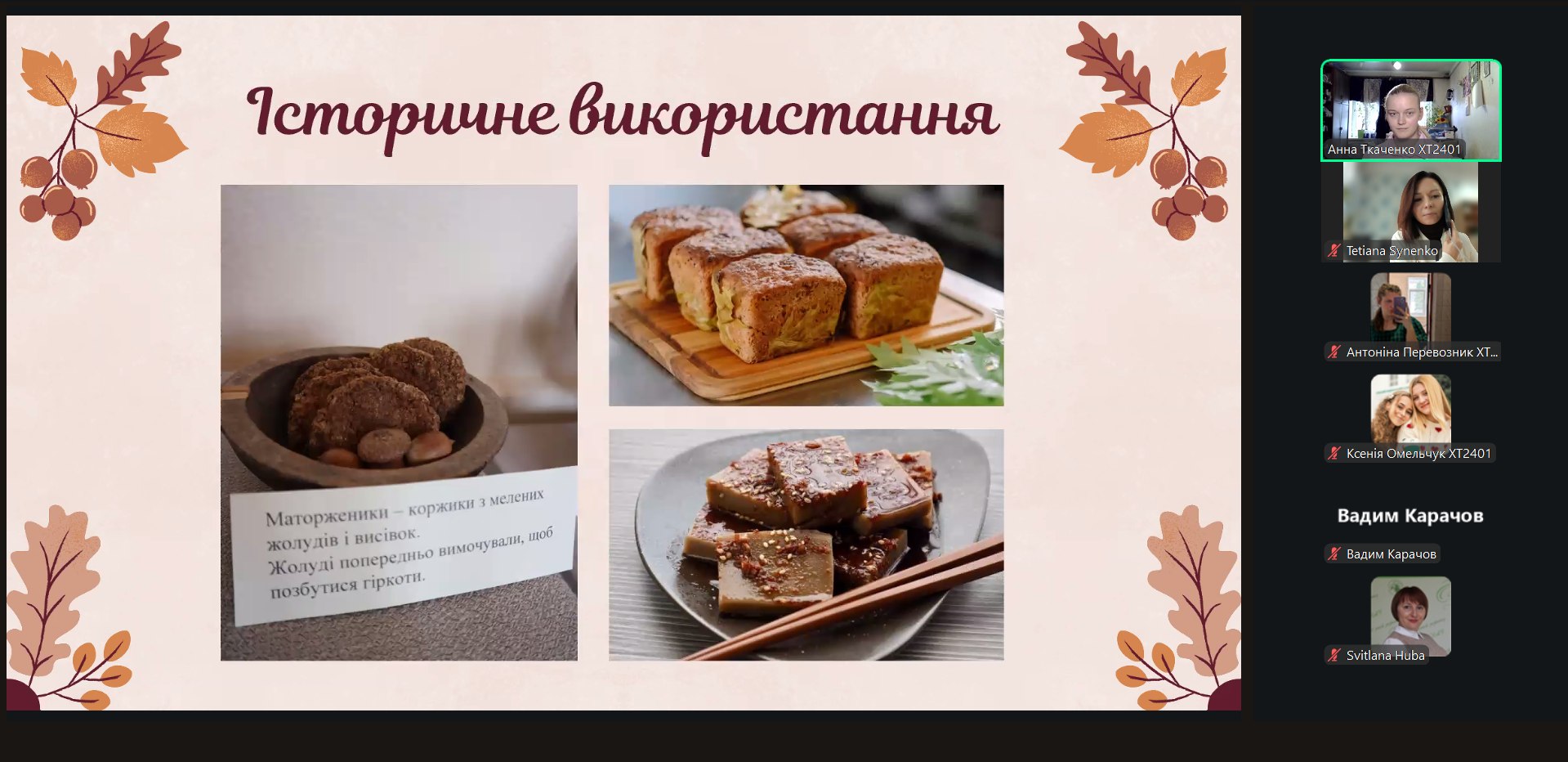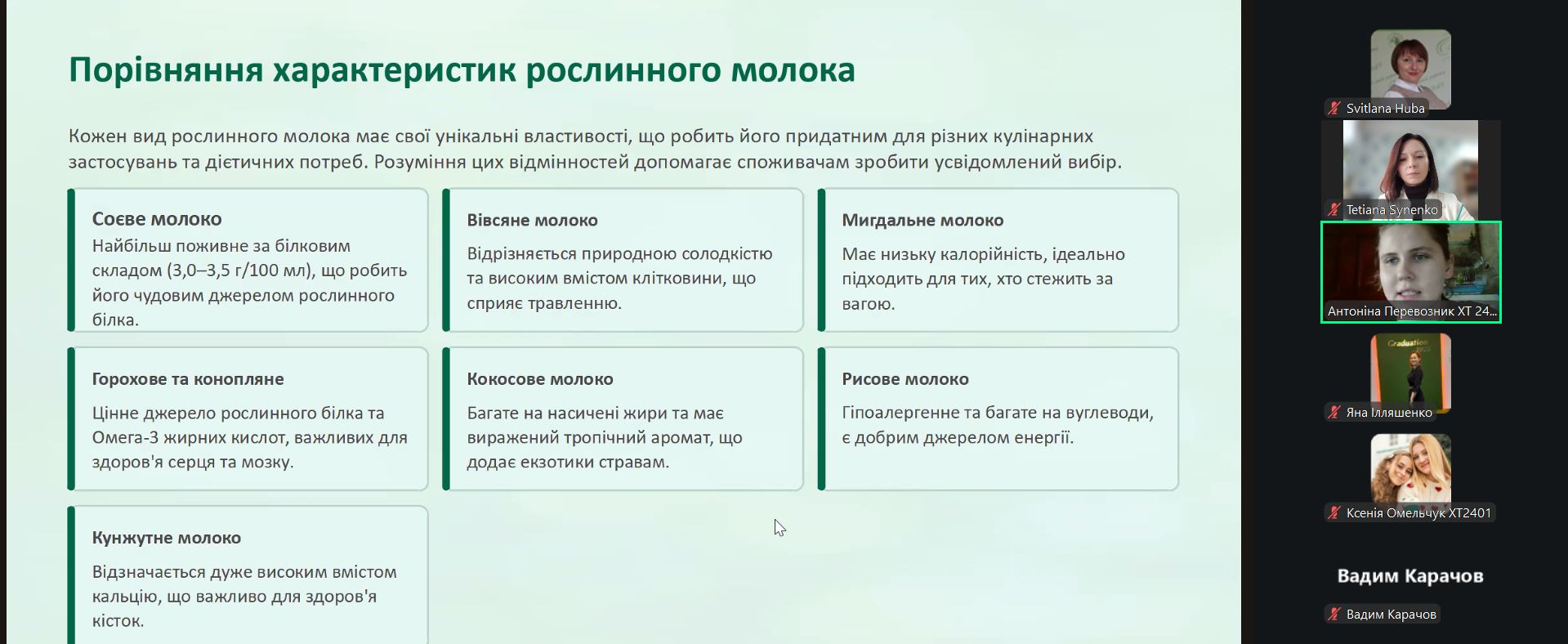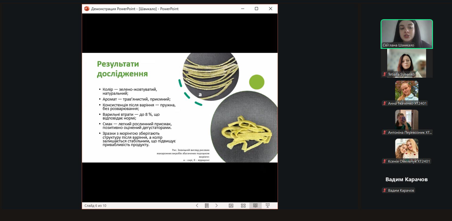 Учасники секції «Харчові технології» висвітлили широке коло інноваційних наукових напрямів, серед яких: переробка екзотичної сировини; мікробіологічні аспекти безпечності продуктів; zero-waste моделі в харчовій промисловості; створення функціональних молочних продуктів; технології ферментованих та рослинних напоїв; органічне ягідництво та сучасні підходи до переробки; інноваційні методи генерування дослідницьких ідей та інженерної творчості. Серед тем викликали інтерес презентації про використання морінги, зеленої гречки, горобини чорноплідної та жолудів як перспективної сировини.