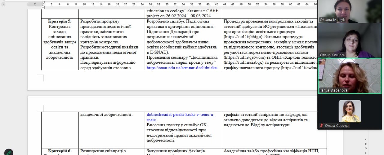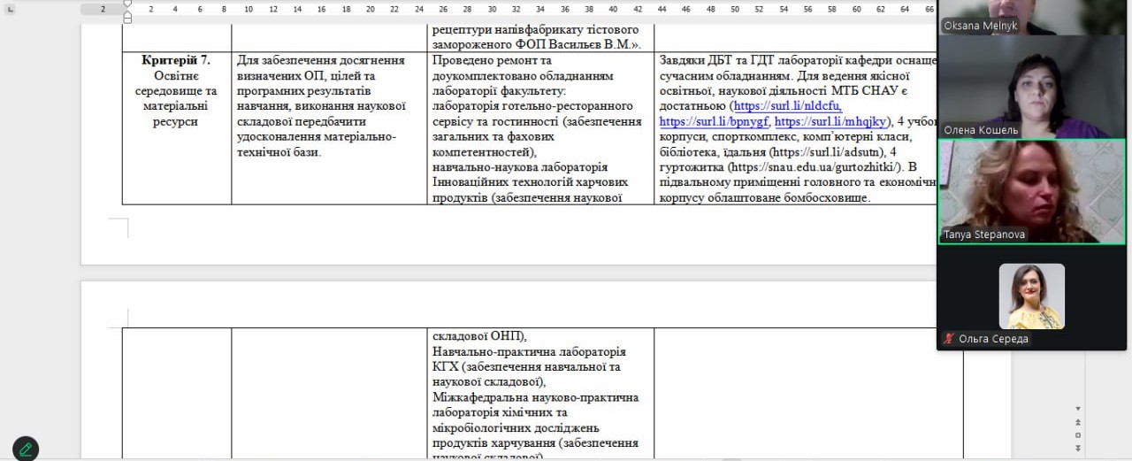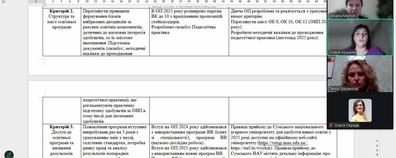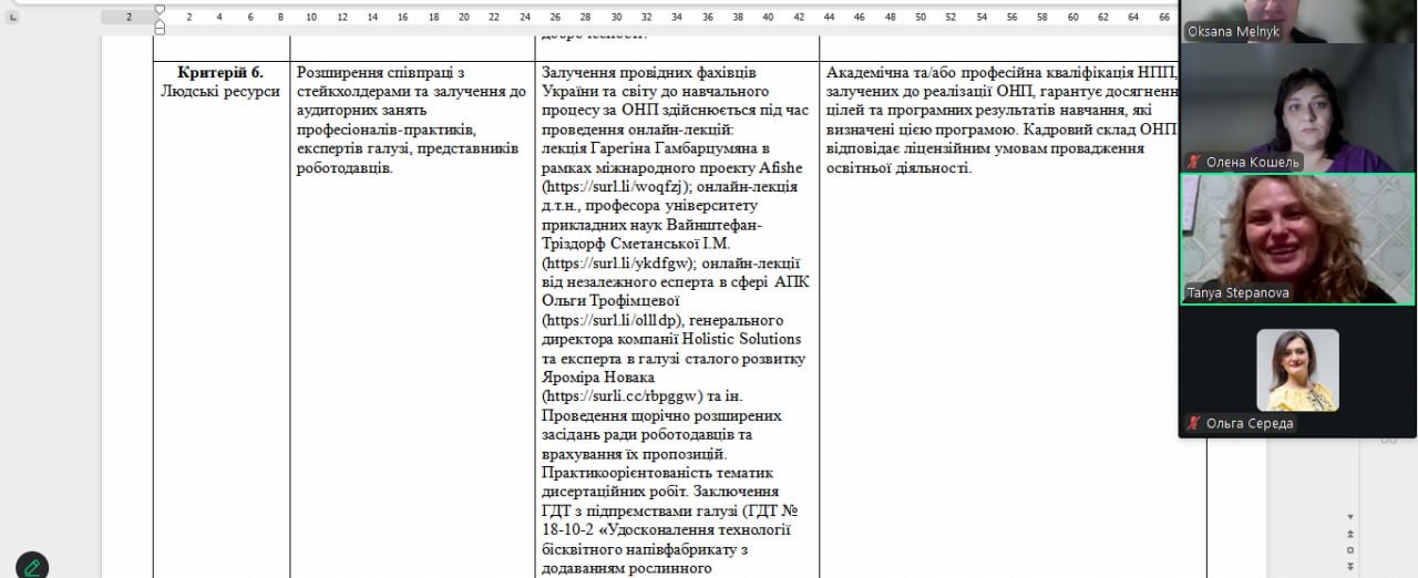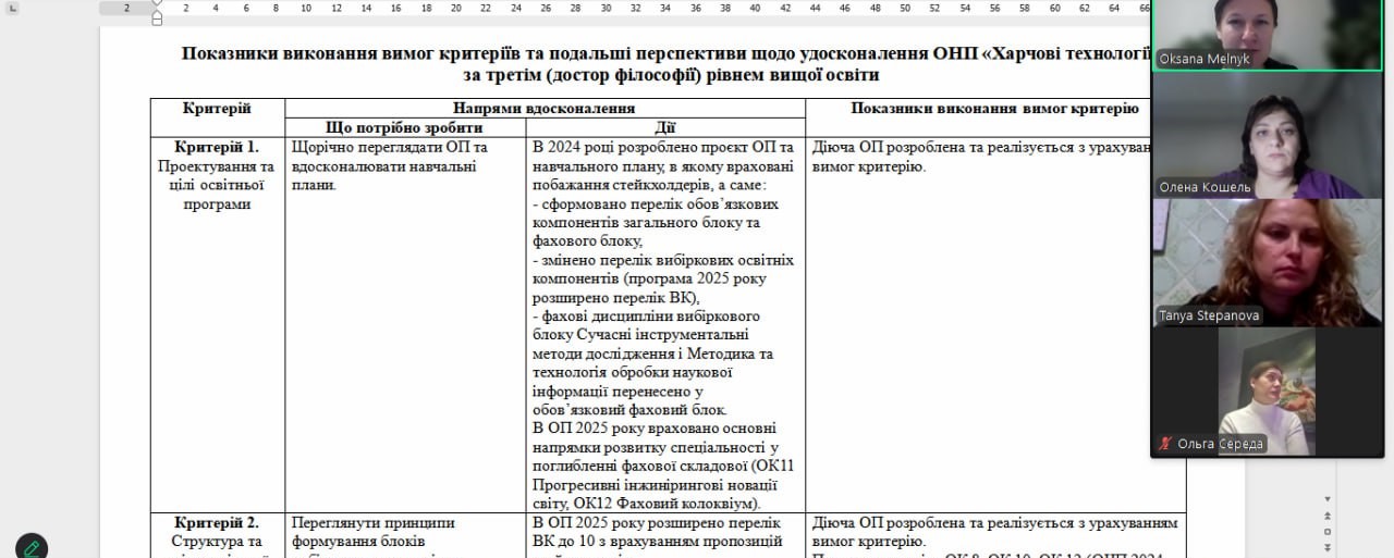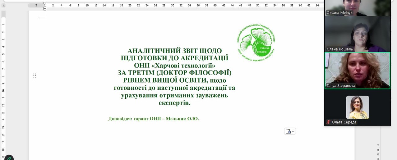 На засіданні Ради із забезпечення якості освітньої діяльності та якості вищої освіти факультету харчових технологій, яке відбулося 04.11.25 року гарантом ОНП Харчові технології підготовки докторів філософії к.т.н., доц. Мельник О.Ю. було представлено аналітичний звіт щодо акредитації ОНП з врахуванням пропозицій та зауважень експертів, в якому було відображено результати самооцінювання якості підготовки здобувачів третього рівня вищої освіти. У звіті проаналізовано структуру та зміст програми, відповідність навчальних планів стандартам вищої освіти, науковий потенціал викладачів, результати наукових досліджень аспірантів, матеріально-технічне забезпечення та ефективність системи внутрішнього контролю якості. Особливу увагу гарант приділила академічній доброчесності, міжнародній співпраці, публікаційній активності та академічній мобільності здобувачів. Метою аналітичного звіту було виявлення сильних сторін, визначення напрямів удосконалення програми й забезпечення її відповідності вимогам Національного агентства із забезпечення якості вищої освіти.