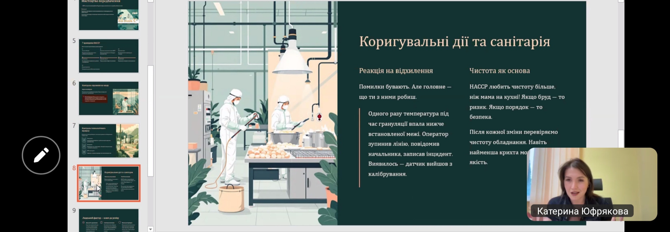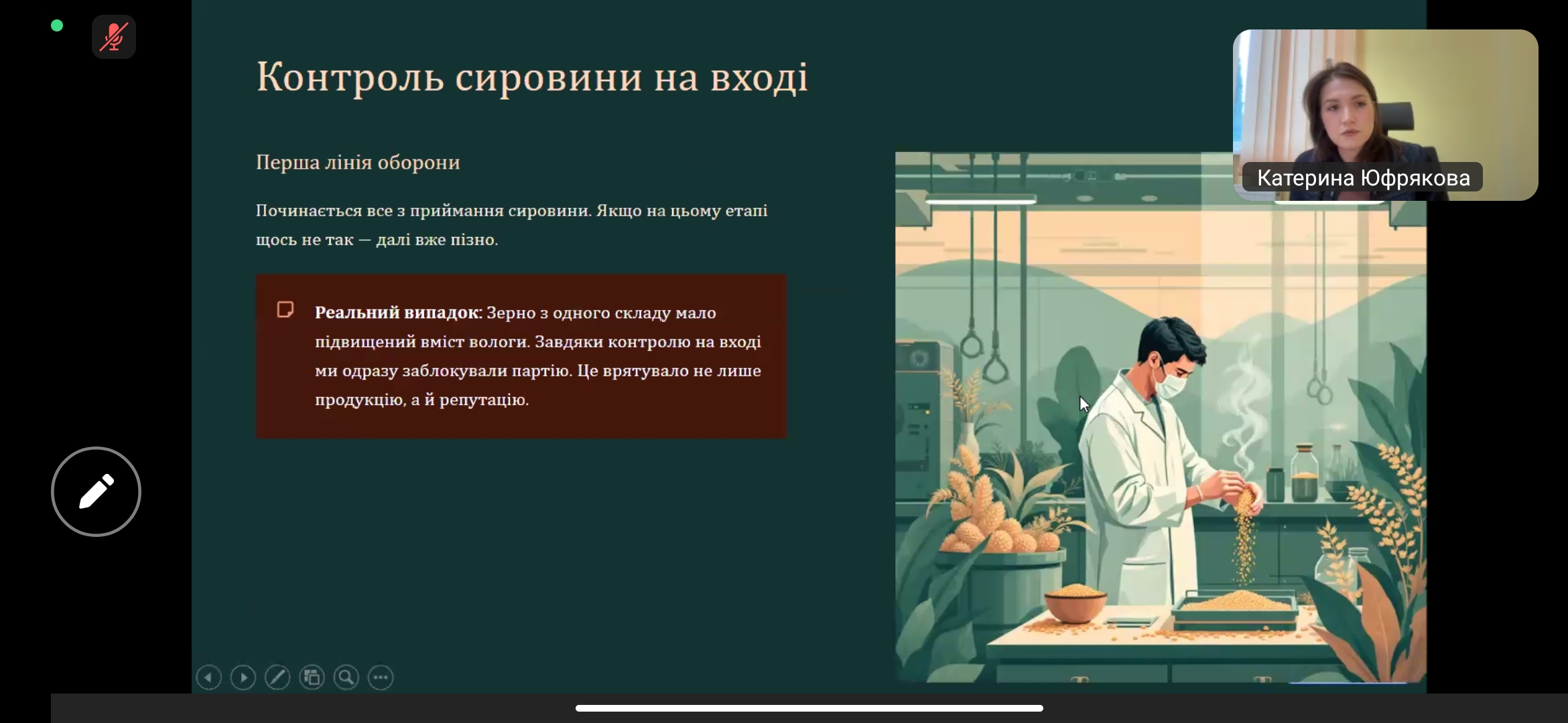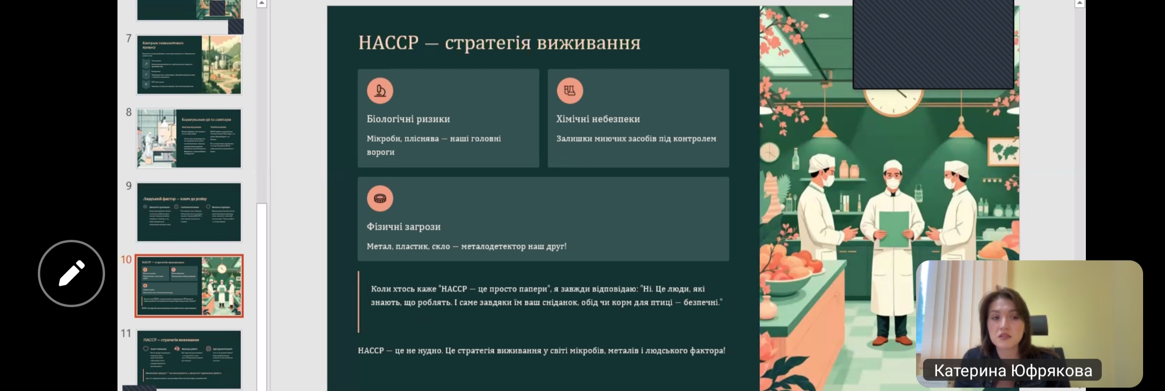 Онлайн-зустріч із Юфряковою Катериною, керівником відділу контролю якості Філії «Внутрішньогосподарський комплекс по виробництву кормів» ТОВ «Вінницька птахофабрика», була присвячена темі «HACCP у дії: як ми насправді запобігаємо харчовим небезпекам». Під час лекції учасники дізналися про принципи та практичну реалізацію системи НАССР, можливі небезпеки у харчовому виробництві та методи їх попередження, а також про етапи контролю якості, що гарантують безпечність продукції. Лекторка поділилася реальними прикладами впровадження системи на підприємстві, що дозволило слухачам зрозуміти її ефективність у зниженні ризиків і підвищенні довіри споживачів. Здобувачі освіти отримали корисний практичний досвід, ознайомилися із сучасними методами управління безпечністю харчових продуктів та зрозуміли важливість командної роботи у процесі впровадження системи. Зустріч стала важливим кроком у формуванні професійних компетентностей майбутніх фахівців харчових технологій.